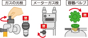 避難する際は器具栓・元栓・ガスメーターバルブ・容器バルブをすべて閉めてください。